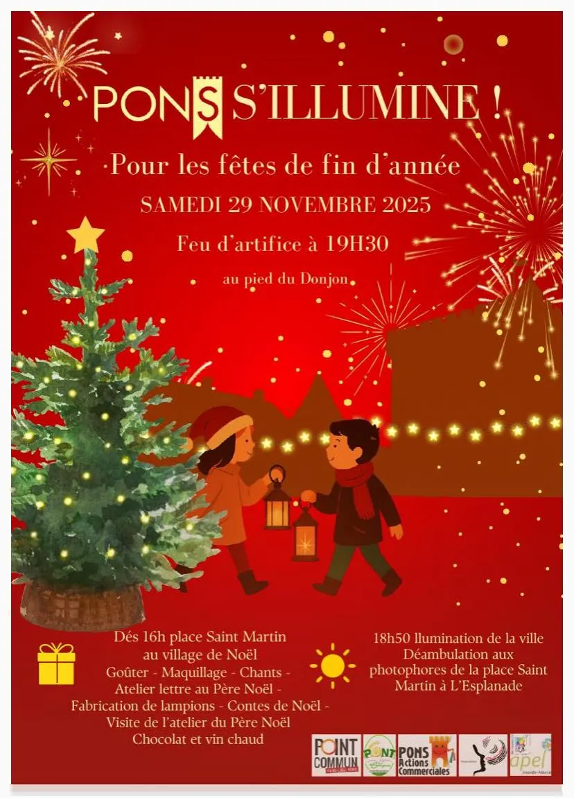 Pons s’illumine 24 Nov 2025 La ville vous donne rendez-vous samedi 29 novembre pour lancer les festivités. Dès 16h, le village de Noël vous accueille sur la place Saint-Martin. À 18h50, la ville s’illuminera officiellement, suivi d’un feu d’artifice à 19h30.